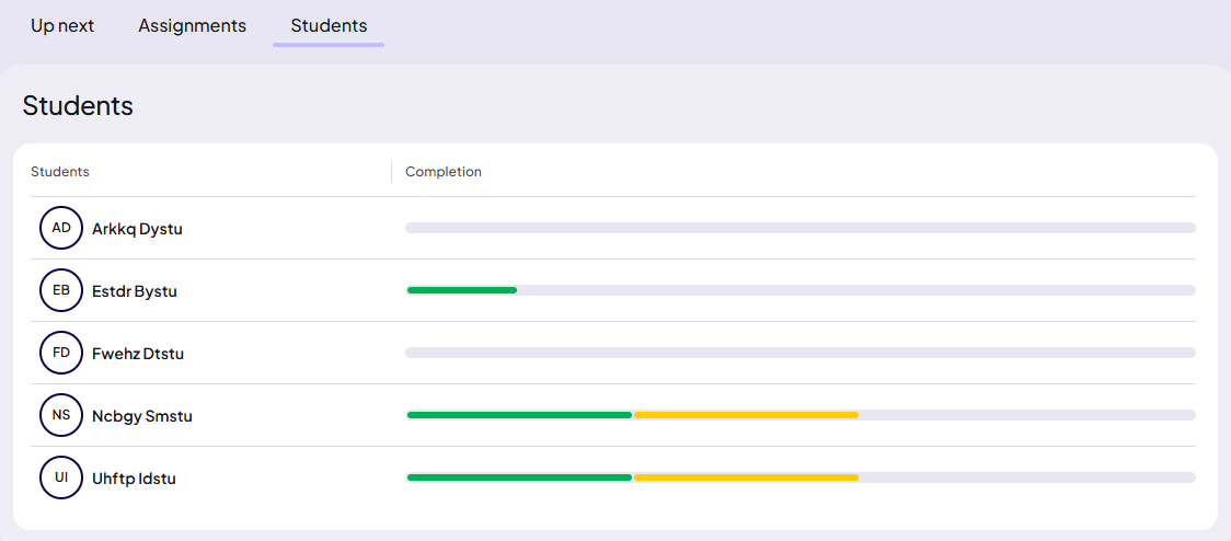 - Select a student’s name to see their progress and performance on all assignments.