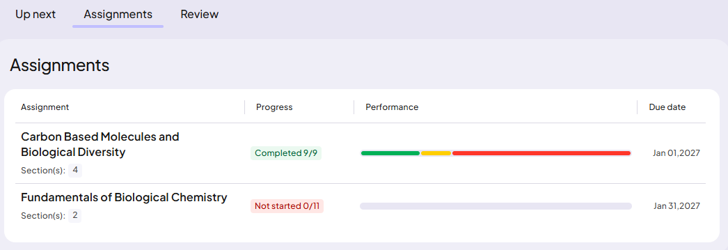 The Assignments tab lists all assignments. You can see your completion progress, performance, and due dates.