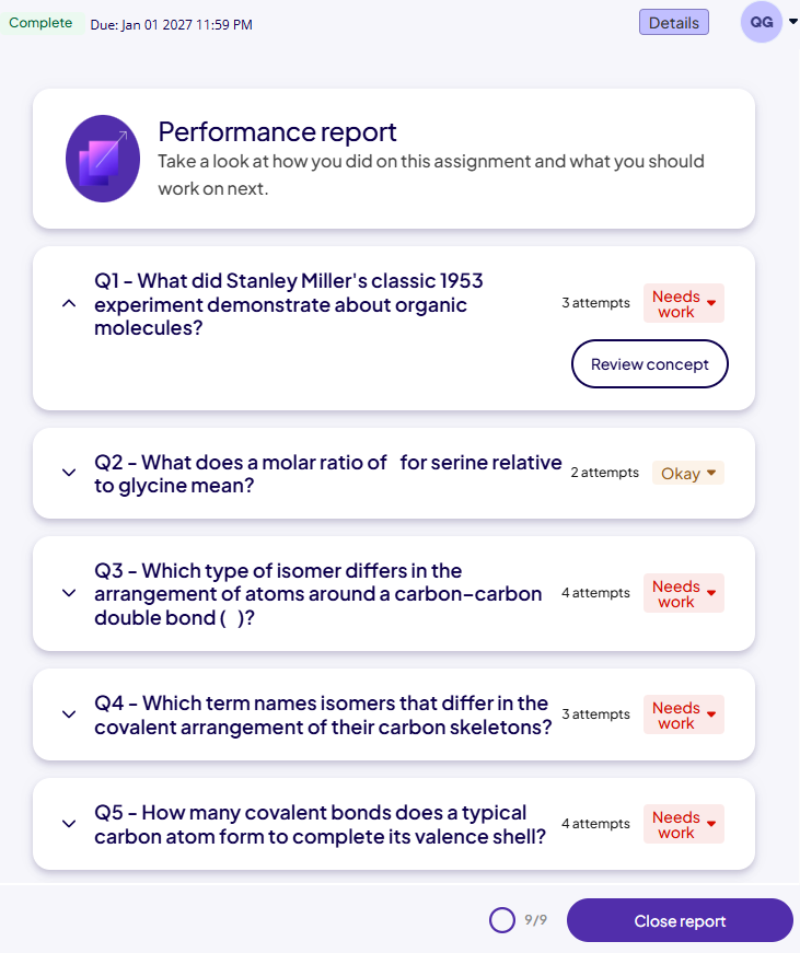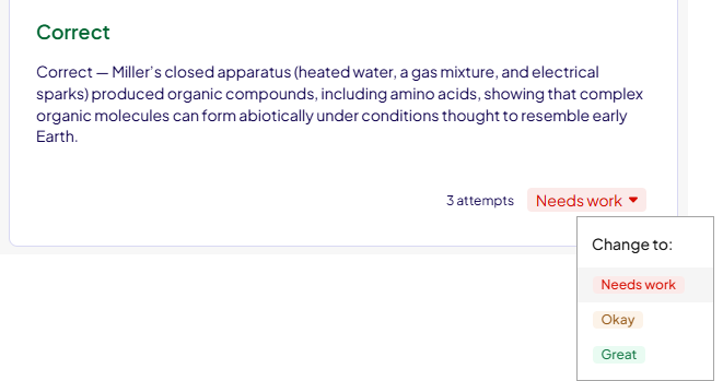 - Based on the number of attempts to answer correctly, you might see Needs work, Okay, or Great.