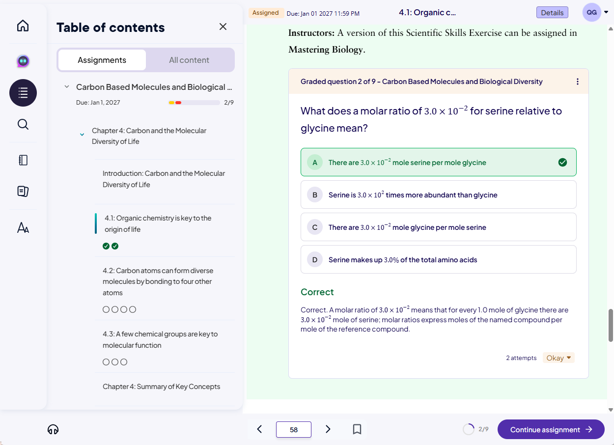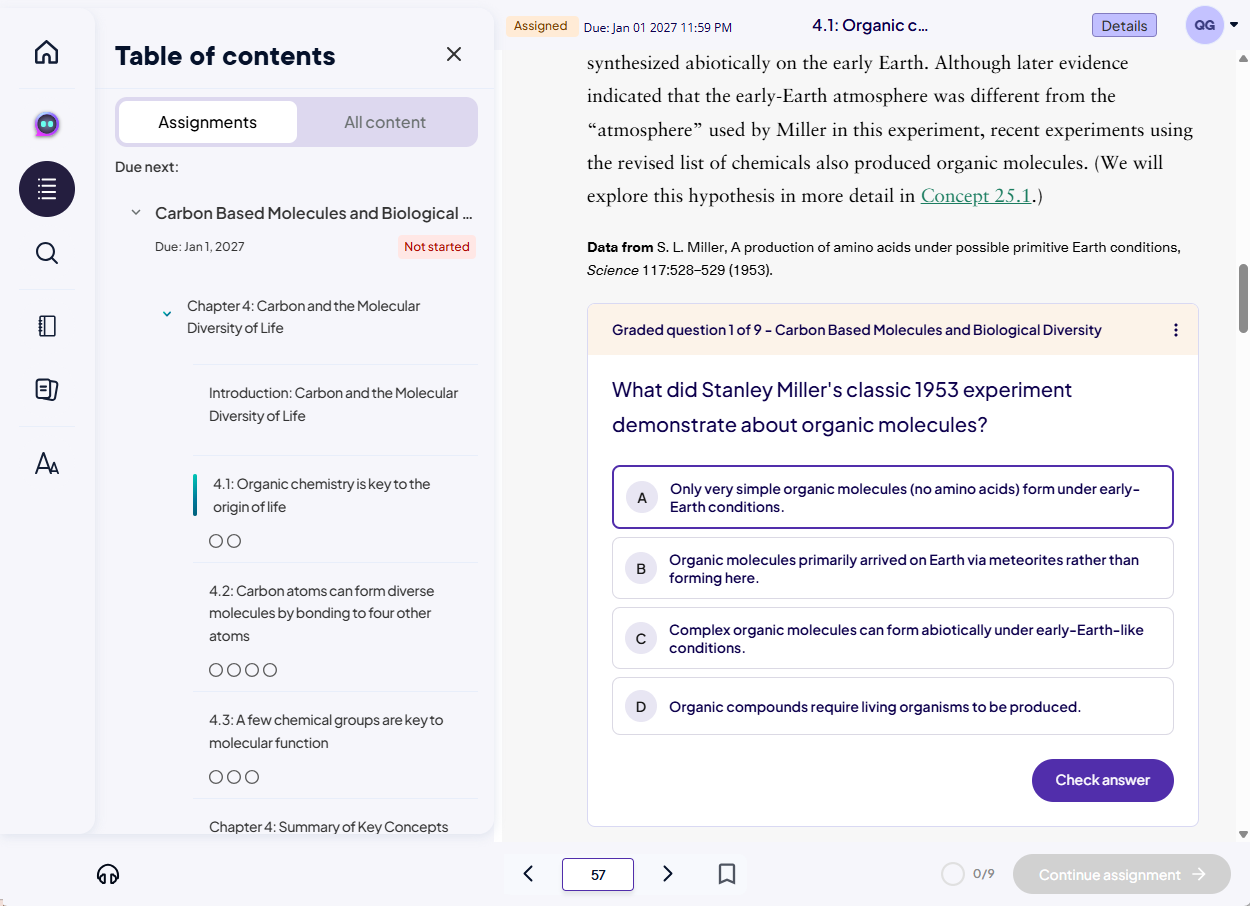 In this example, section 4.1 has two questions, section 4.2 has four, and section 4.3 has three. The assignment has nine questions in total. - Select an answer to the question and choose Check answer.