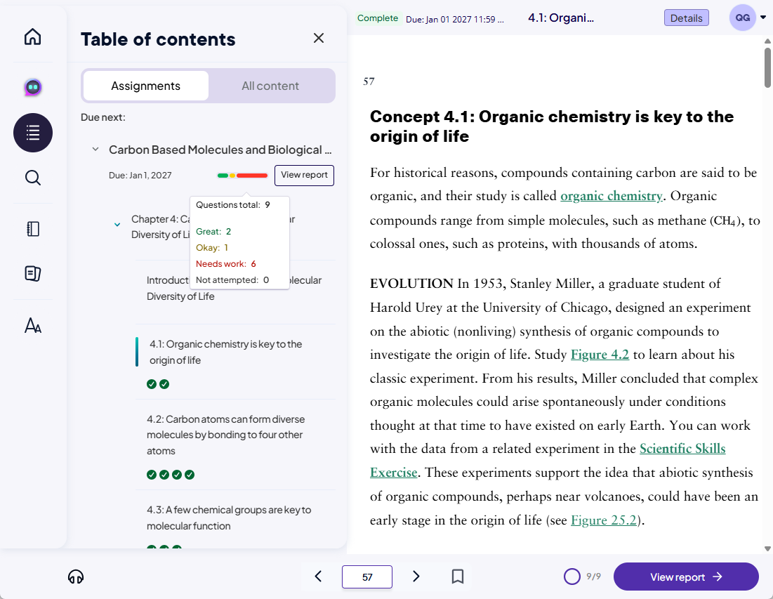 The Table of contents opens. On the Assignments tab, you can see the sections with questions. - Read the eTextbook content and answer the embedded questions.