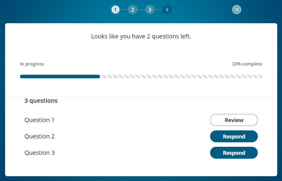 You can view and submit questions in any order. Use the navigation to revisit a question and see or change your response. Learn about question types.
