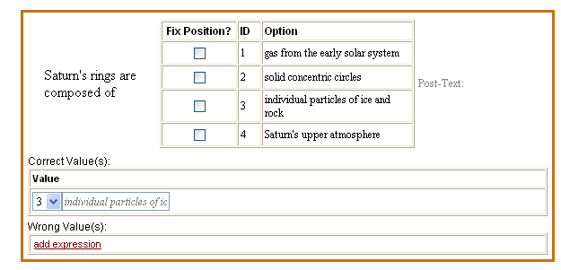 However, if answers are a series of numbers or other elements that make more sense in a specific order, check the Fix Position box. Also, if the correct answer is All of the above, make sure that is the last option in the list and that Fix Position is checked..