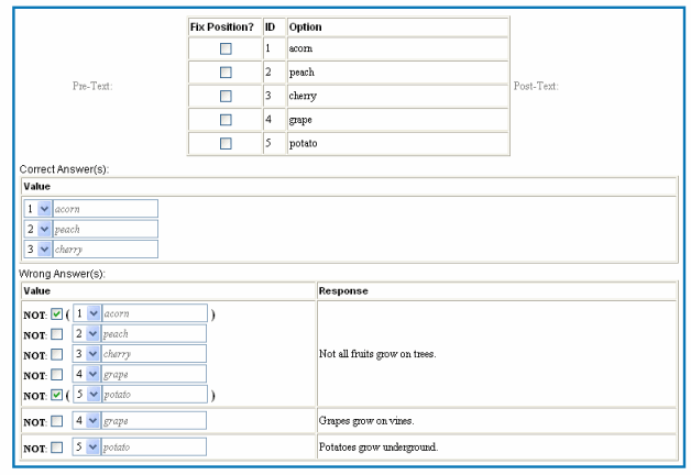 The first wrong answer response (WAR) displays if a student selects peach, cherry, and grape, but not acorn or potato (because the NOT box is checked for them). This is a very specific wrong answer. The next two responses are less specific, displaying if students select either grape or potato, regardless of the other options selected.